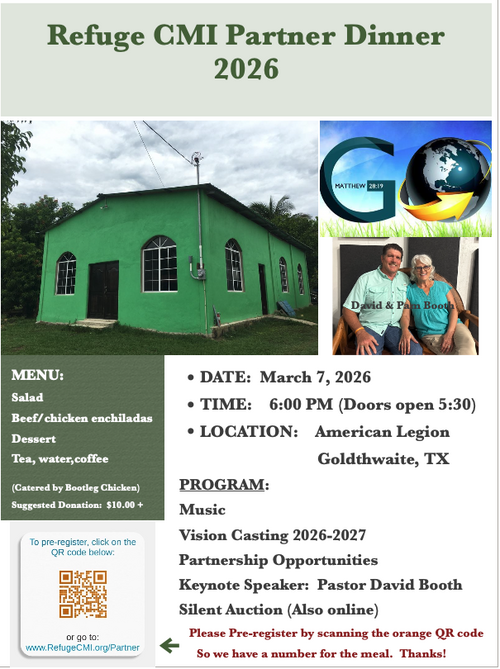 We are in the final planning stages for our annual Partner Dinner for 2026. We are excited to announce that Pastor David Booth and his wife Pam will be our keynote speakers this year. David was born on the mission field in Costa Rica to missionary parents, and was raised on the mission field in Mexico, so he has first-hand knowledge of life on the mission field. They recently returned from a year in Costa Rica and David also traveled with Refuge CMI back to Belize (the second time) for the annual Christmas outreaches this last December. We look forward to hearing what the Lord lays on his heart for Refuge CMI and our partners. Trust me, you do not want to miss this.